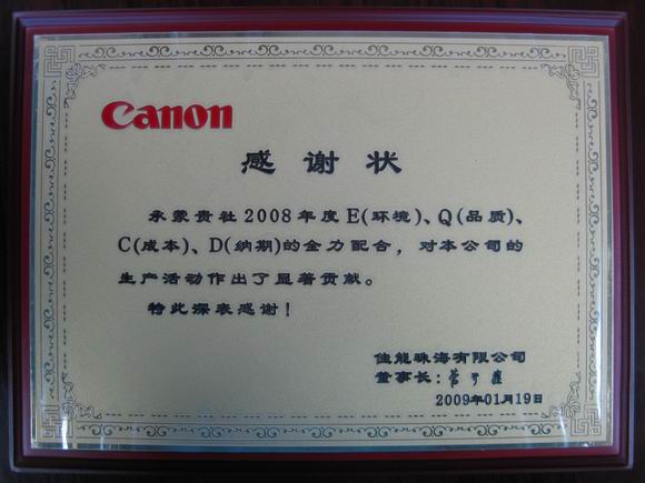 利達(dá)光電榮獲佳能珠海2008年度最佳供應(yīng)商稱號(hào)