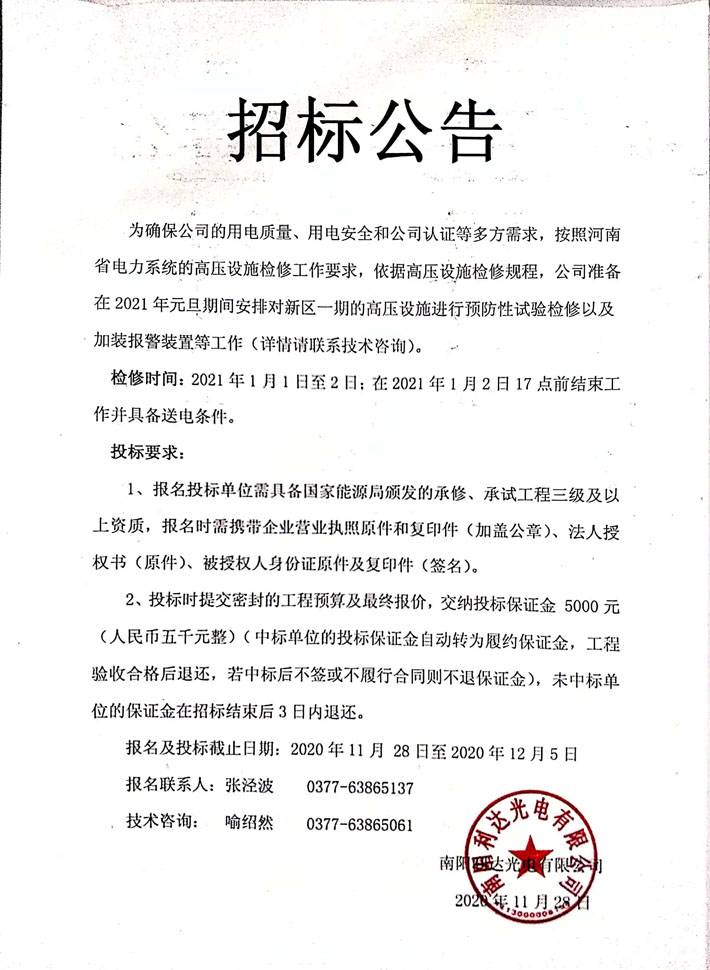 新廠區(qū)高壓配電設(shè)備預(yù)防性試驗招標公告