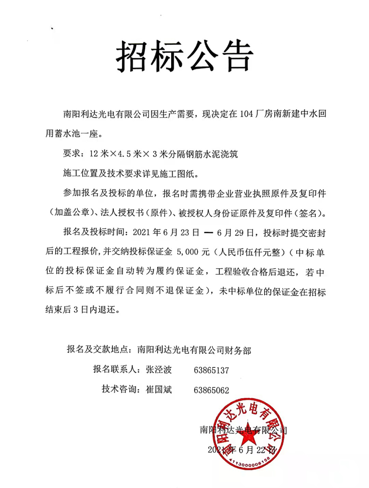 104廠(chǎng)房南新建中水回用蓄水池一座招標(biāo)公告