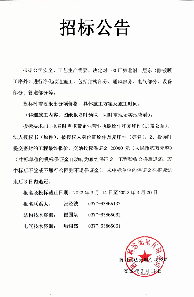 103廠房北附一層?xùn)|(除鍍膜工序外)凈化改造工程招標(biāo)